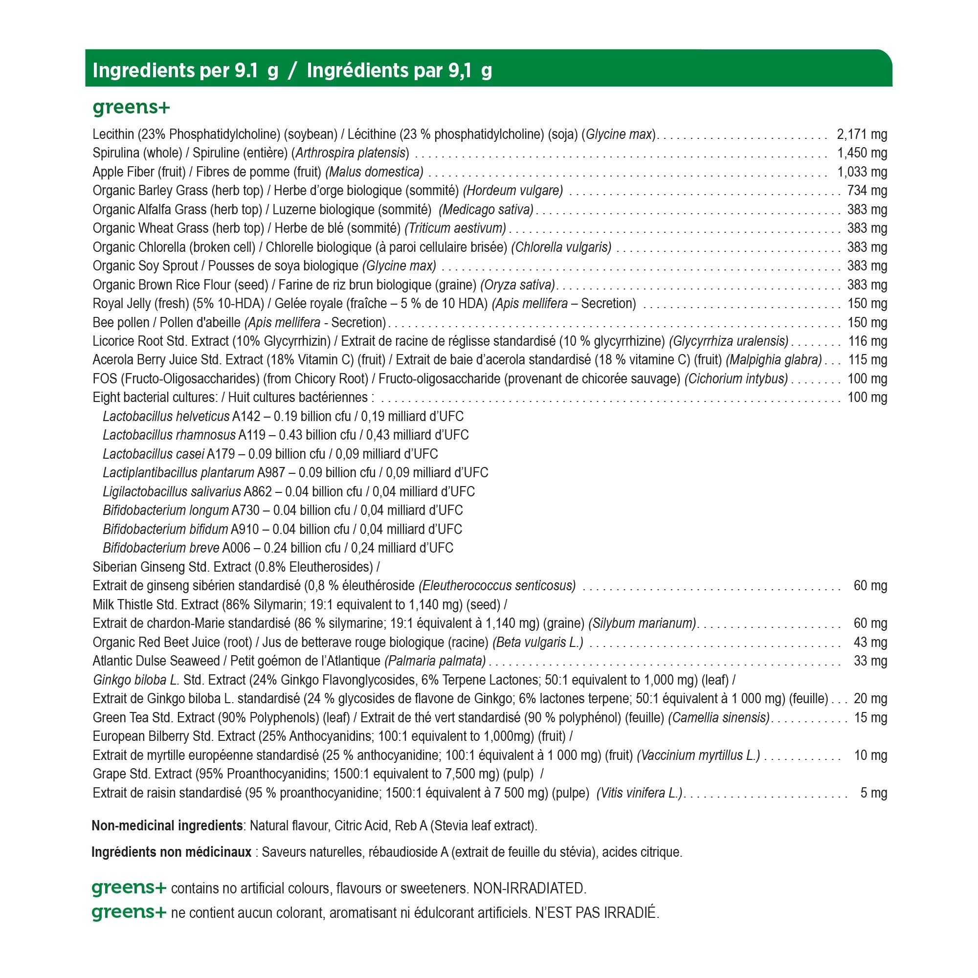 Getting a full spectrum of essential and diverse nutrients can be difficult through your diet alone and buying a whole variety of fruits & vegetables every week is overwhelming and expensive. Greens+ Original is designed with 40% more essential and full-spectrum phytonutrients than leading competitors, in 1 convenient daily serving, so you can cover all your nutritional needs with Canada's first and only research-proven superfood formula. Each serving provides targeted natural benefits to support your healthy lifestyle, aging process, immune health, energy and stress levels, and overall sense of wellbeing with a synergistic blend of vitamins, minerals, antioxidants, adaptogens, as well as gut-loving probiotic cultures. Greens+ Original Tropical Fruit is naturally sweetened with Stevia.