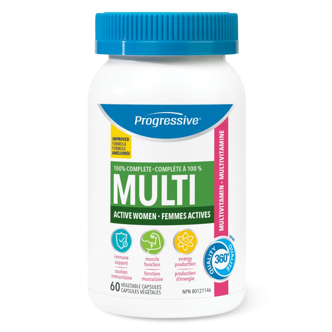 Progressive’s Multi 100% Complete for Active Women is designed for women on the go, who may work long hours, exercise regularly or experience added stress. This improved formula provides added support beyond a regular multivitamin. This formula features unique added ingredients like DIM, Chastetree berry, Maca, Ashwagandha and Siberian ginseng to address active women’s health needs, including promoting healthy estrogen balance.