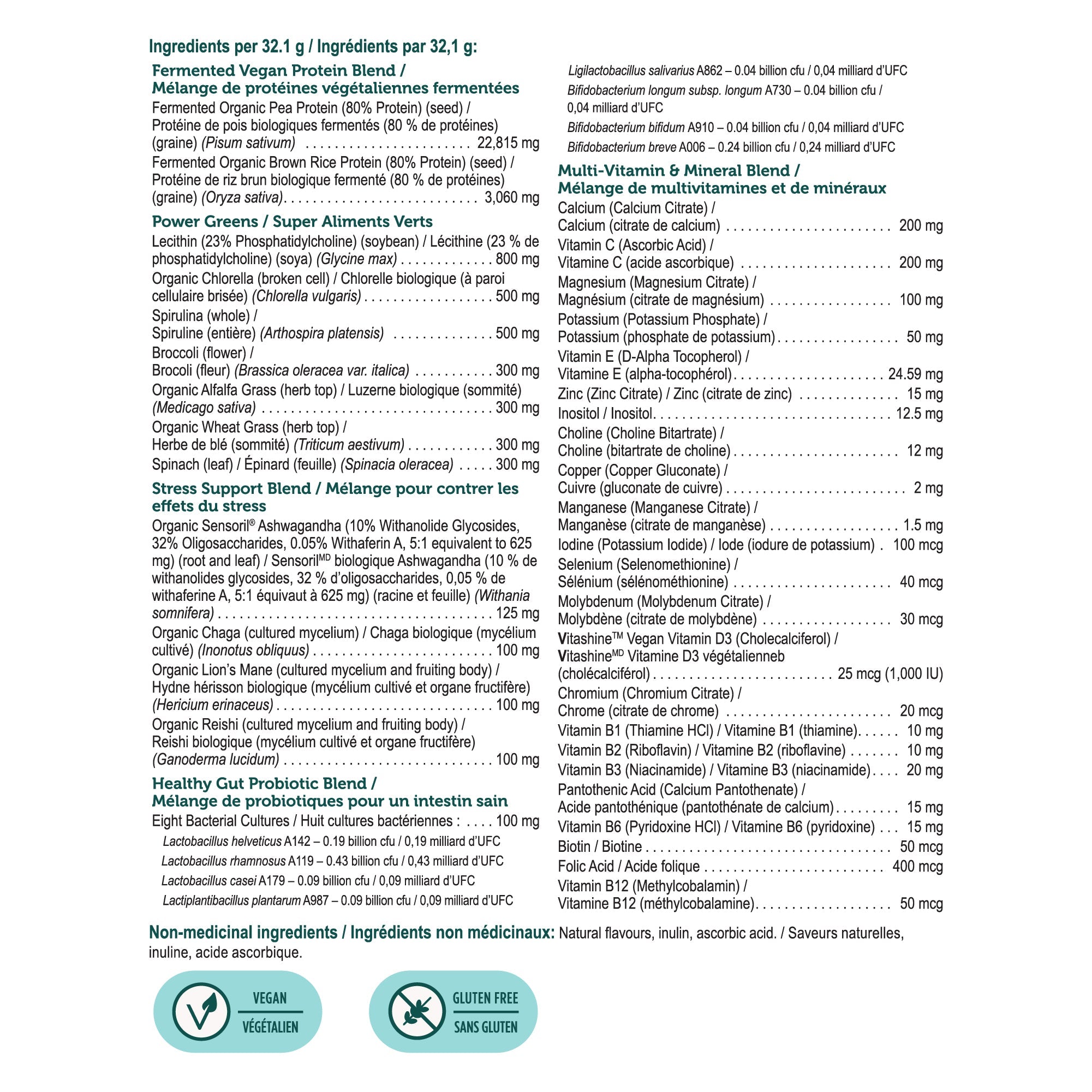 all-in-one has been designed to simplify your nutrition, your supplement cabinet and your life! Our comprehensive formula contains 21g of smooth and delicious plant-based protein (sourced from rice and peas), powerful greens, 1.1B CFU of gut-loving probiotics and unique stress-supporting ingredients you won't find anywhere else.