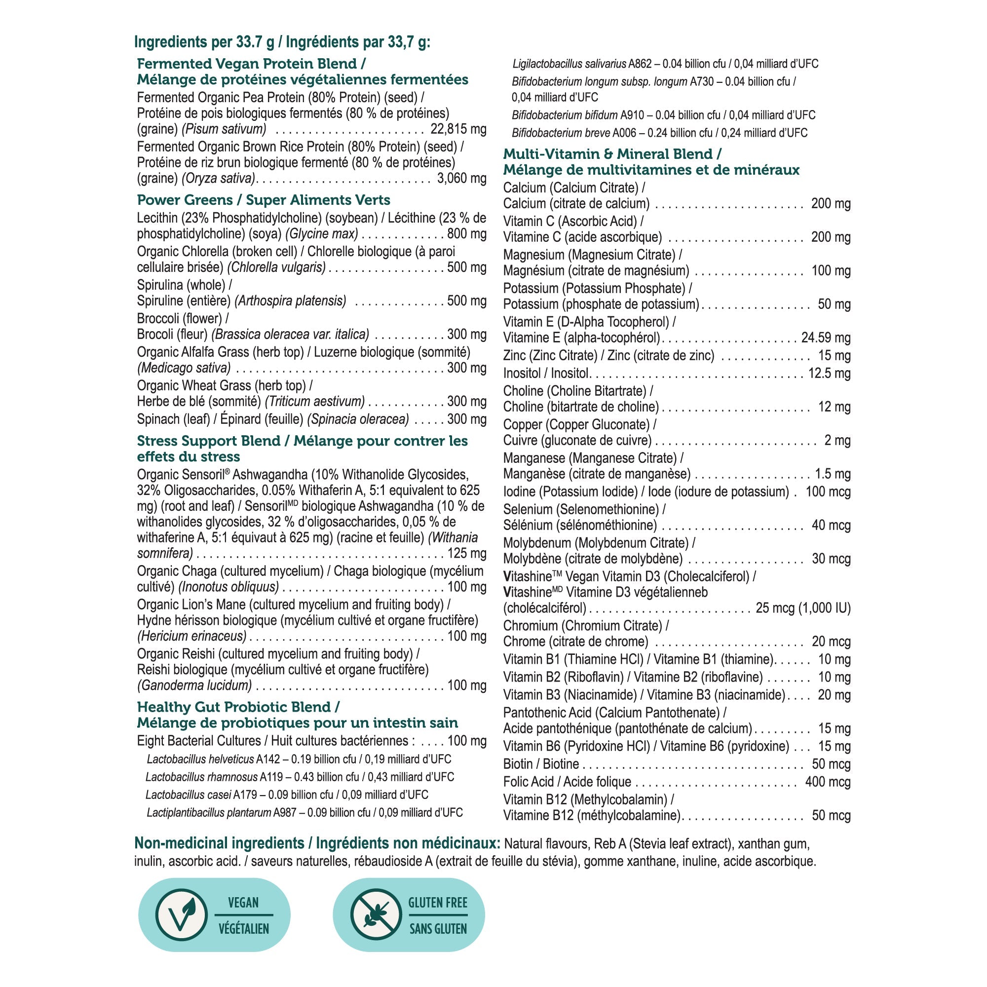 all-in-one has been designed to simplify your nutrition, your supplement cabinet and your life! Our comprehensive formula contains 21g of smooth and delicious plant-based protein (sourced from rice and peas), powerful greens, 1.1B CFU of gut-loving probiotics and unique stress-supporting ingredients you won't find anywhere else.