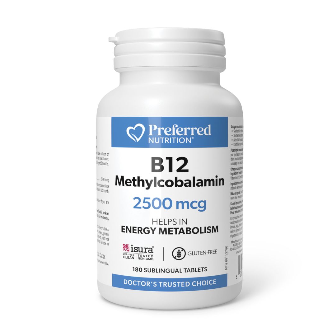 Preferred Nutrition B12 Methylcobalamin delivers the biologically active form of vitamin B12 in quick-dissolve sublingual tablets. One tablet per day provides 2500 mcg of vitamin B12 to help maintain energy metabolism in the body and prevent vitamin B12 deficiency. This gluten-free formula is suitable for vegetarians and vegans.