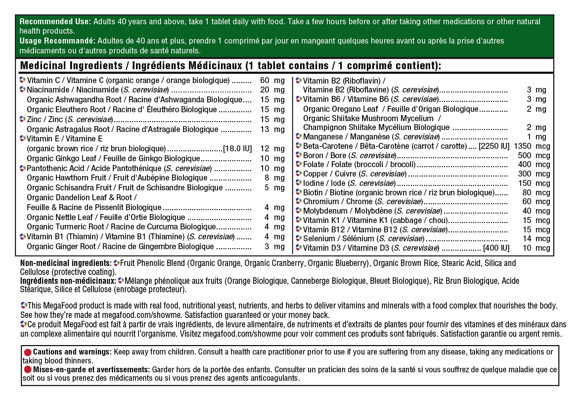 MegaFood® Men Over 40™ One Daily is specifically formulated without iron to support the health and wellbeing of men over the age of 40. (Iron is not recommended for men unless specifically directed by their healthcare practitioner.) Our multi nourishes the body in a convenient, once-daily tablet that can be taken with or without food, and includes FoodState® B vitamins to assist with healthy cardiovascular function, healthy energy production and nervous system health. 400 IU (10 mcg) of vitamin D supports healthy bones, and an array of whole foods and herbs provide additional phytonutrients.