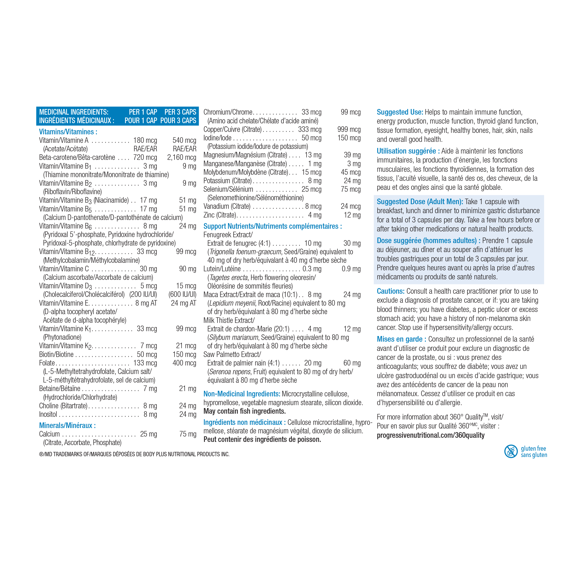 Progressive 100% Complete MultiVitamin for Adult Men addresses the nutritional needs of a "normal" modern lifestyle. For those who do not exercise regularly, who experience average stress, and are not constantly on the go, Progressive MultiVitamins for Adult Men is the perfect fit. This improved formula features a complex of supporting nutrients designed to address Men’s health needs. These supporting nutrients include Saw Palmetto, Fenugreek, and Maca.