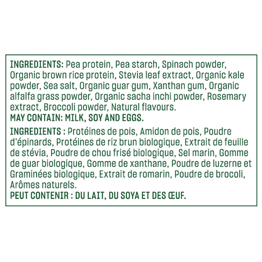 - heaps of greens: a nutritious blend of spinach, kale, alfalfa grass and broccoli without the bitter taste