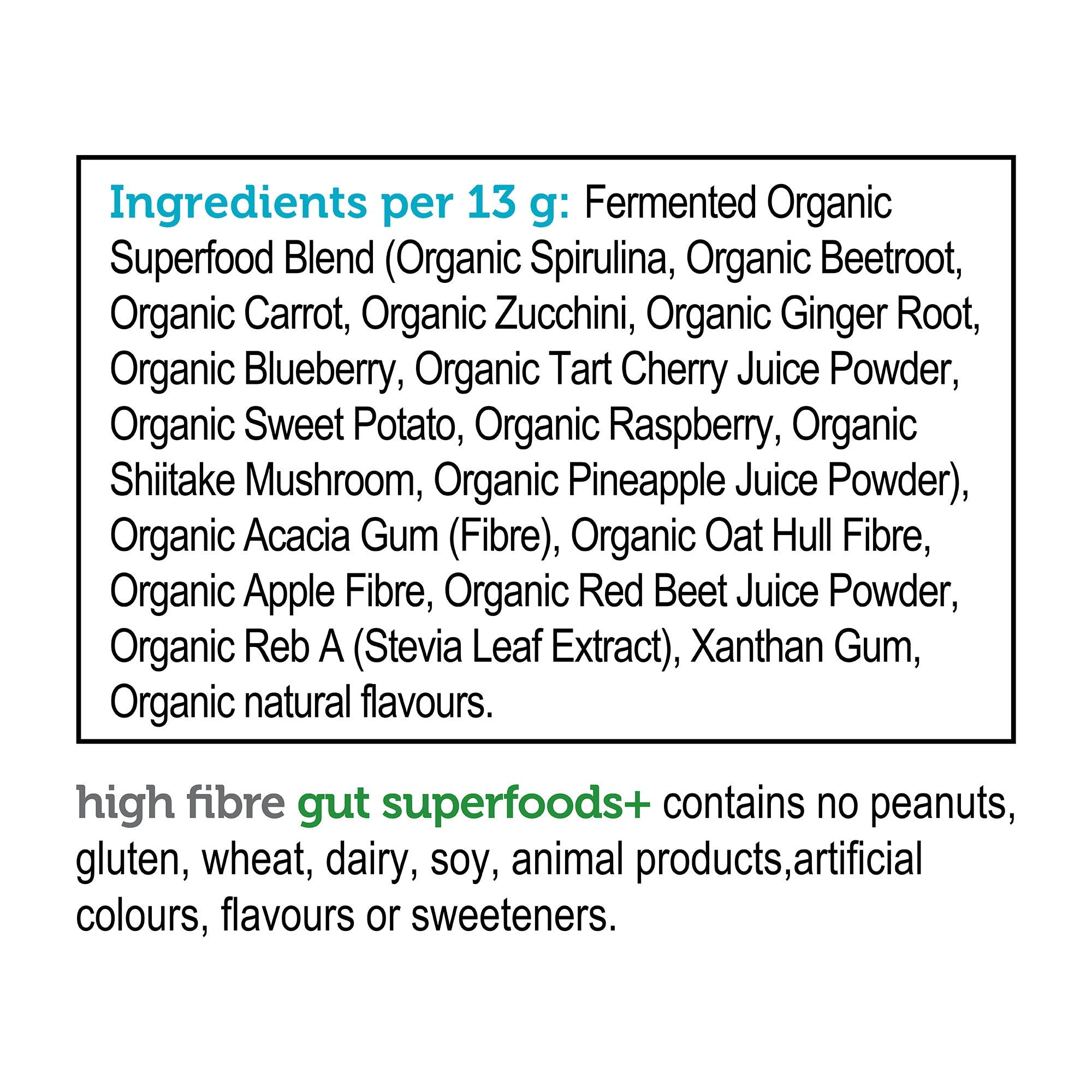 high fibre gut superfoods+ is packed with nutrient-dense whole foods. This vibrant, rainbow-inspired blend brings together the best nature has to offer, providing a boost with fresh, high-quality fruits and a variety of land and sea vegetables.