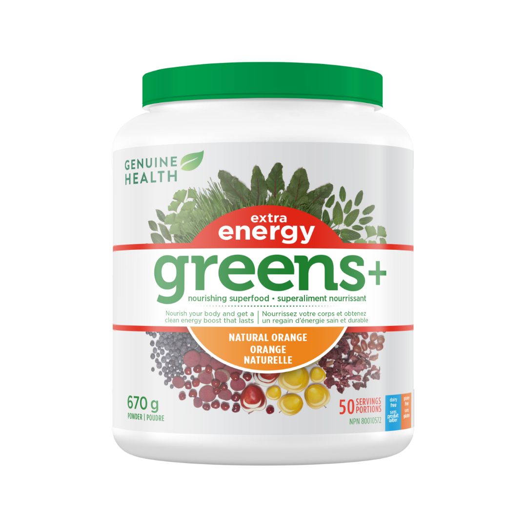 Genuine Health Greens+ Extra Energy is a powdered green food supplement that can be mixed with water or juice. It is made with over 30 different greens, fruits, and vegetables and is also gluten-free and non-GMO. The powder comes in a natural orange flavour, which can be a convenient way to increase your daily intake of vitamins and minerals. Greens+ Extra Energy can help you feel more energetic and alert and may also help improve your digestion. If you are looking for a way to boost your health, Genuine Health Greens+ Extra Energy is a great option.