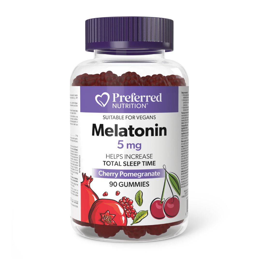 Preferred Nutrition Melatonin helps restore the natural sleep-wake cycle for better, more restorative sleep. Melatonin can help reduce the time it takes to fall asleep, increase sleep quality and duration, and reduce jet lag. This vegan-friendly gummy is gelatin-free, non-GMO, and has a delicious cherry pomegranate flavour.
