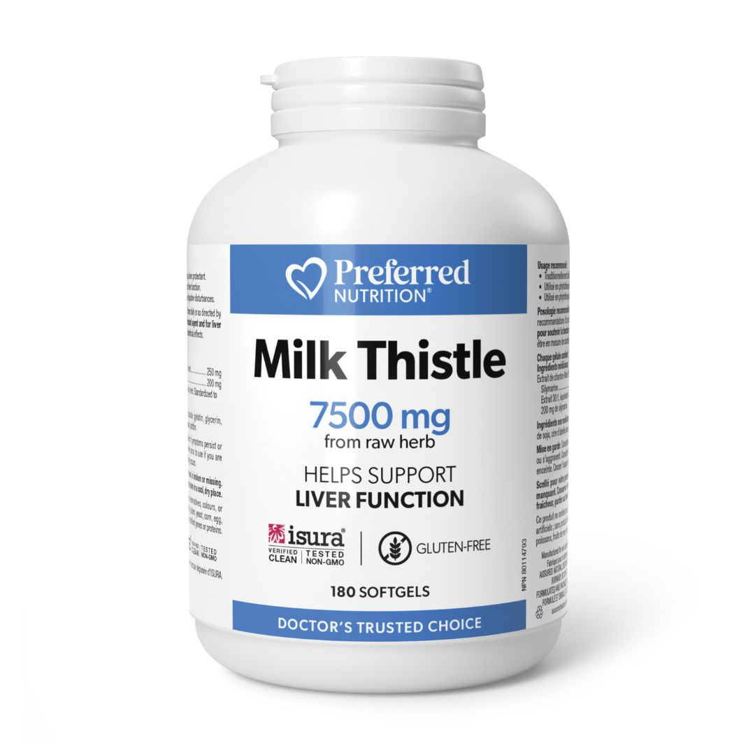 Preferred Nutrition Milk Thistle is a high-potency formula used in herbal medicine to help support liver function and relieve digestive disturbances. The 30:1 milk thistle extract is delivered in easy-to-take softgels. Each softgel provides the equivalent of 7500 mg of raw herb, standardized to 200 mg of milk thistle’s active silymarin compounds.